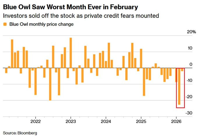 Blue Owl zablokował w lutym swój detaliczny fundusz prywatnego kredytu po tym, jak wnioski o wypłaty środków podwoiły się w 2025 roku. Dziś BlackRock ogłosił, że jego fundusz prywatnego kredytu o wartości 26 miliardów dolarów również ogranicza wypłaty [-4% na otwarciu]. Ten sam BlackRock, który właśnie wyzerował prywatną pożyczkę — pożyczkę wycenianą na wartość nominalną jeszcze trzy miesiące temu. Drugi raz, kiedy to zrobił.