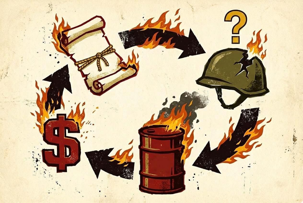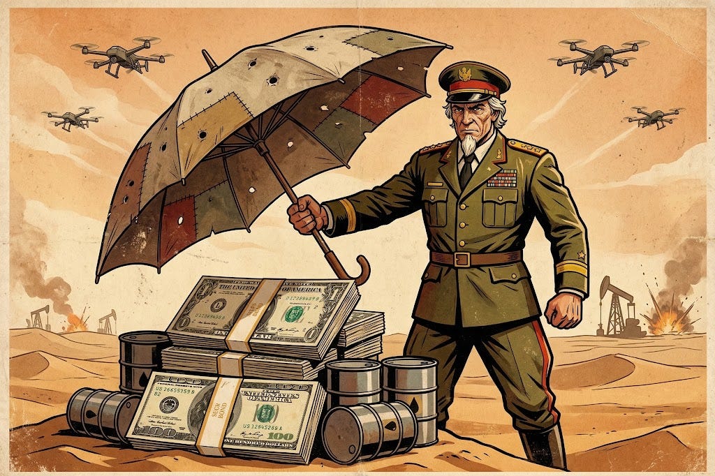 Cały sens projekcji siły USA na Bliskim Wschodzie — baz, grup lotniskowcowych, gwarancji bezpieczeństwa — zawsze polegał na ochronie systemu dolara. Na utrzymaniu przepływu ropy w dolarach, na utrzymaniu pętli recyklingu w ruchu. Nie z dobroci serca. Pozwalało to USA prowadzić deficyty bez końca, eksportować inflację do reszty świata i pożyczać po stopach, o jakich żaden inny dłużnik nie mógłby nawet marzyć.