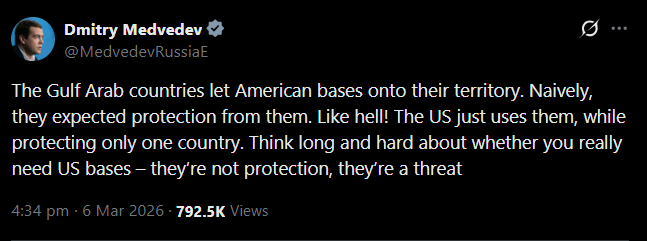 Amerykańskie bazy w całej Zatoce - Bahrajn, Katar, Kuwejt, ZEA - zawsze przedstawiano jako fizyczne ucieleśnienie tej gwarancji. Mięsień stojący za papierem. Były ochroną. Tyle że teraz te bazy są celami. Kraje, które je goszczą, są atakowane właśnie dlatego, że je goszczą. To, co kiedyś było "obecnością wojskową USA jako tarczą”, załamało się i stało się "obecnością wojskową USA jako namalowanym celem”.