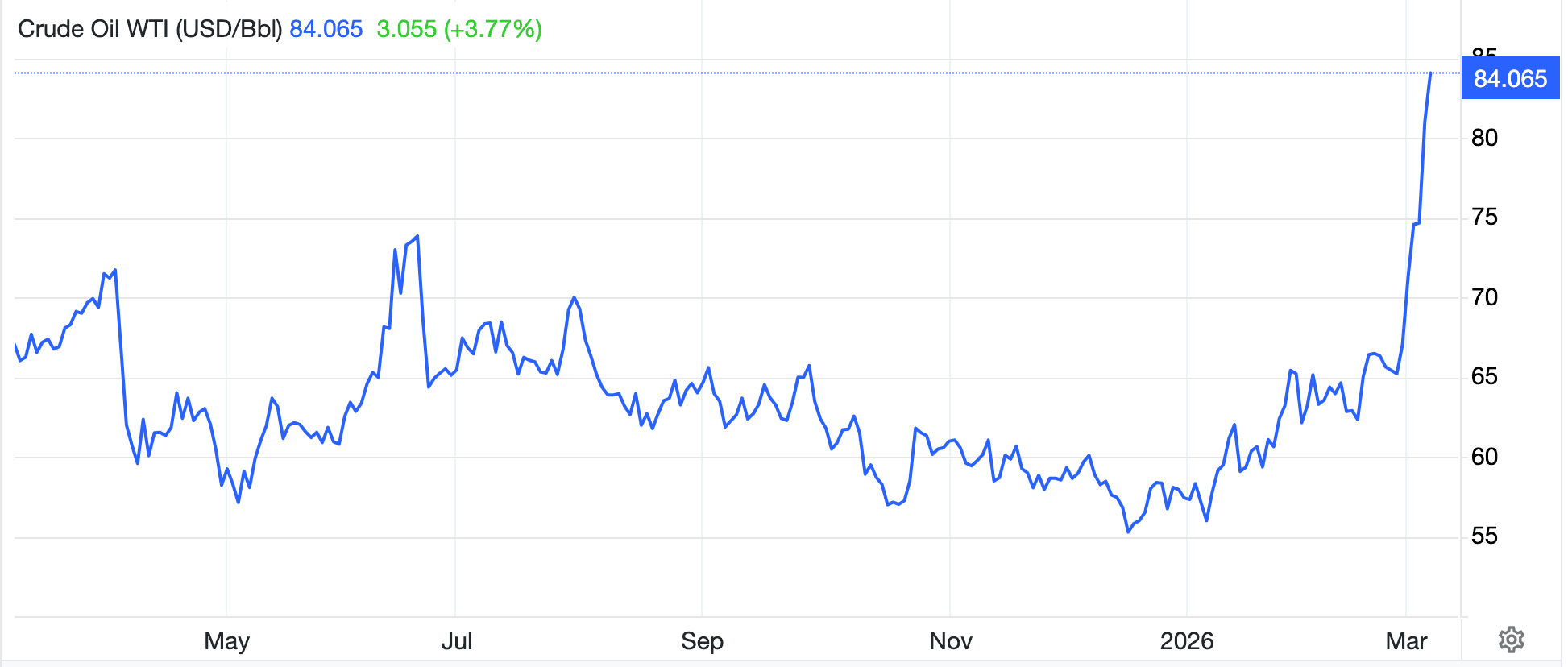 Najważniejsze jest jednak to, że blokada Cieśniny Ormuz powoduje gwałtowny wzrost cen energii, co pokazuje wykres ropy.