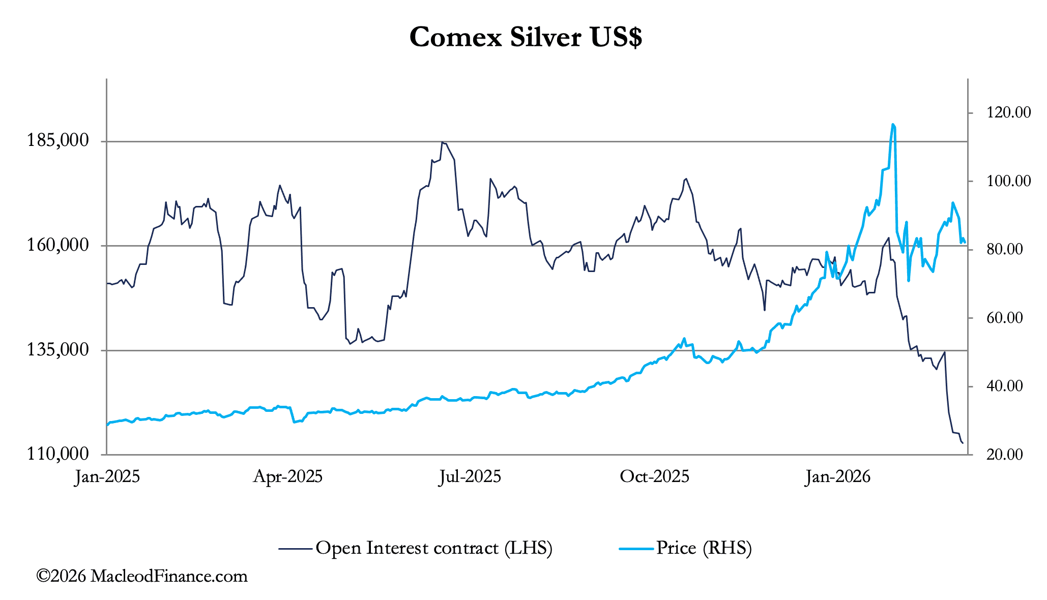 Sytuacja dostaw na Comexie jest dramatyczna — zarejestrowanych do dostawy jest jedynie równowartość 16 250 kontraktów na srebro. Dla porównania, do tej pory w ramach kontraktu marcowego dostarczono 6466 kontraktów. Kontrakt marcowy nadal jest kupowany z oczywistym zamiarem odebrania fizycznej dostawy, podobnie jak kontrakt kwietniowy, który może być realizowany od ostatniego tygodnia marca.