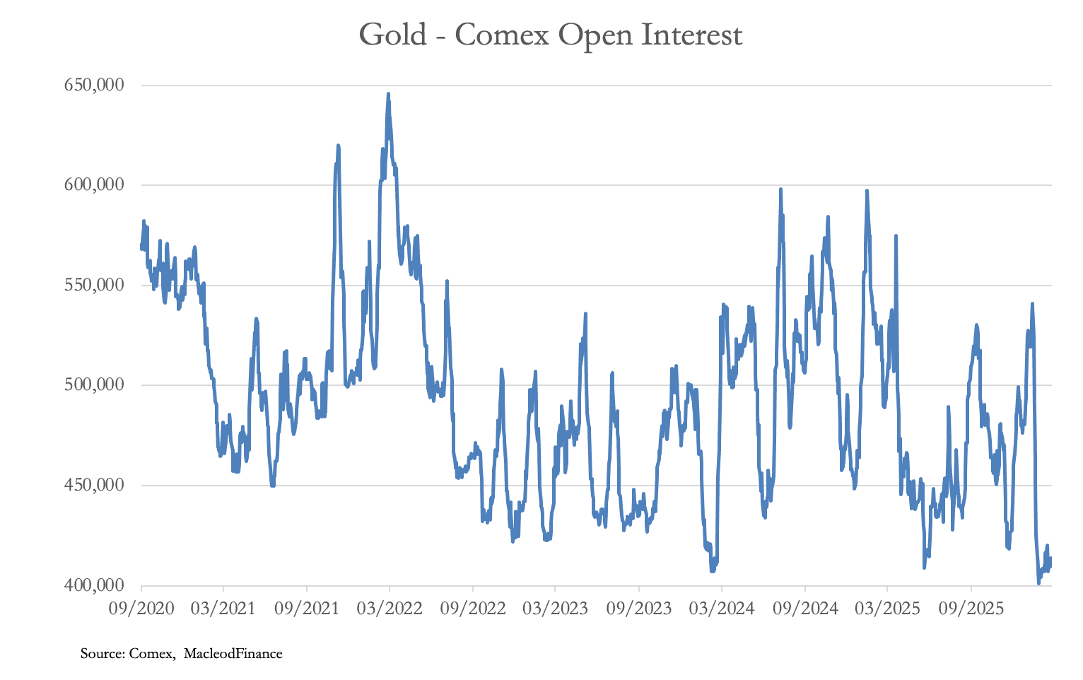 Dodatkowo można założyć, że istnieje silny popyt na konta akumulacji złota oferowane przez chińskie banki detaliczne, przy rocznych oszczędnościach gospodarstw domowych wynoszących dodatkowe 5–6 bilionów dolarów i odzwierciedlających publiczny popyt na sztabki inwestycyjne. Podobnie jak w przypadku srebra, zainteresowanie spekulacyjne złotem jest minimalne, a liczba otwartych pozycji na Comexie znajduje się na najniższym poziomie od czasu pandemii Covid.