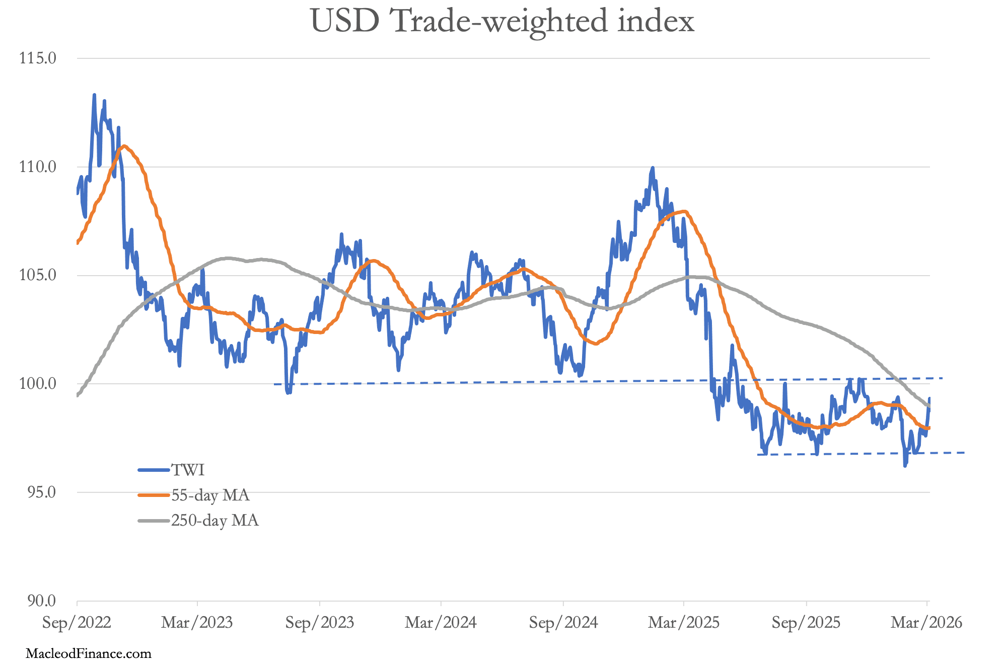 Jak wspomniano powyżej, naturalną reakcją rynku na nową wojnę z Iranem jest założenie, że bezpieczeństwo można znaleźć w gotówce w dolarach. W związku z tym indeks dolara ważony handlem zagranicznym USA wzrósł względem innych walut, co pokazuje kolejny wykres.