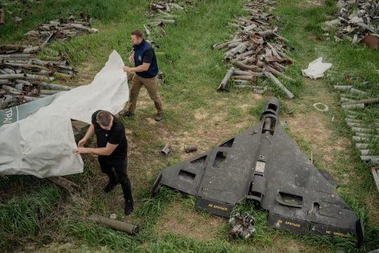 Dane przekazywane przez Rosję pochodzą z floty satelitów dostarczających informacji wywiadowczych do operacji wojskowyc. Flota ta jest zarządzana przez Rosyjskie Siły Powietrzno-Kosmiczne, znane pod rosyjskim akronimem WKS. Na zdjęciu dwóch mężczyzn przykrywających zestrzelony rosyjski dron Shahed białymi plandekami na polu pełnym szczątków rakiet w Charkowie na Ukrainie.