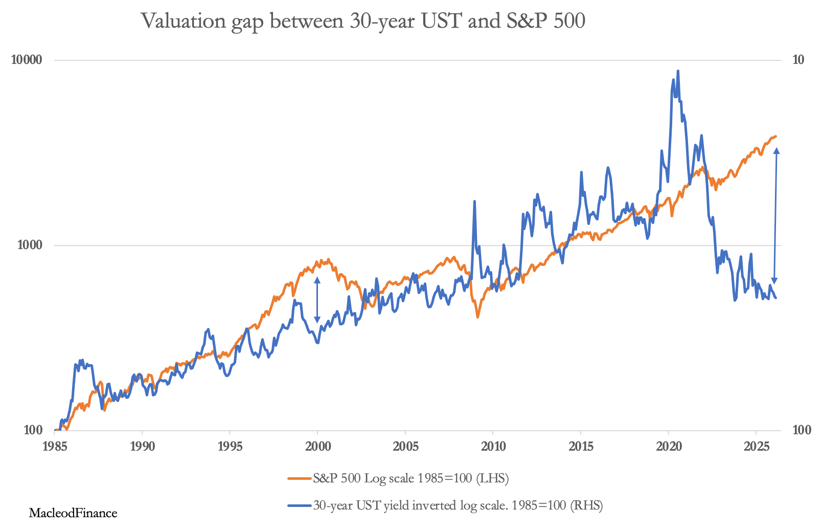 Wykres ten pokazuje, że w porównaniu do obligacji indeks S&P jest ponad dwukrotnie droższy niż w szczycie bańki dotcomów (pokazane przez dwa zestawy strzałek). Jest to kulminacja ery finansjalizacji, która rozpoczęła się w połowie lat osiemdziesiątych. Nieograniczona przez system waluty fiducjarnej, ta bańka finansowa napędzana kredytem jest prawie na pewno większa niż cokolwiek widziano wcześniej, w tym "szalone lata dwudzieste”, które doprowadziły do krachu na Wall Street w 1929 roku.