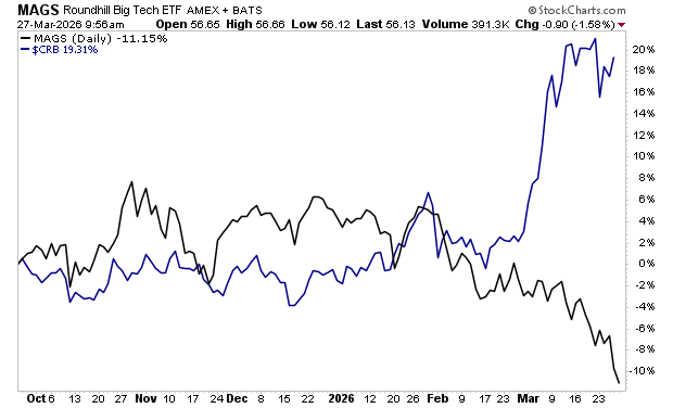 MAG-7 się zwija (siedem dominujących firm technologicznych — Apple, Microsoft, Amazon, Alphabet, Meta, Nvidia i Tesla. które odegrały kluczową rolę w napędzaniu wzrostu rynku) podczas gdy ceny surowców gwałtownie rosną.