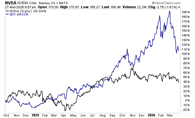 Nvidia (NVDA) to najważniejsza na świecie spółka w branży sztucznej inteligencji. Ale spółki wydobywające złoto (GDX) osiągają ogromne wyniki w ciągu ostatnich dwóch lat… nawet po uwzględnieniu niedawnego spadku akcji GDX spowodowanego przymusową likwidacją.