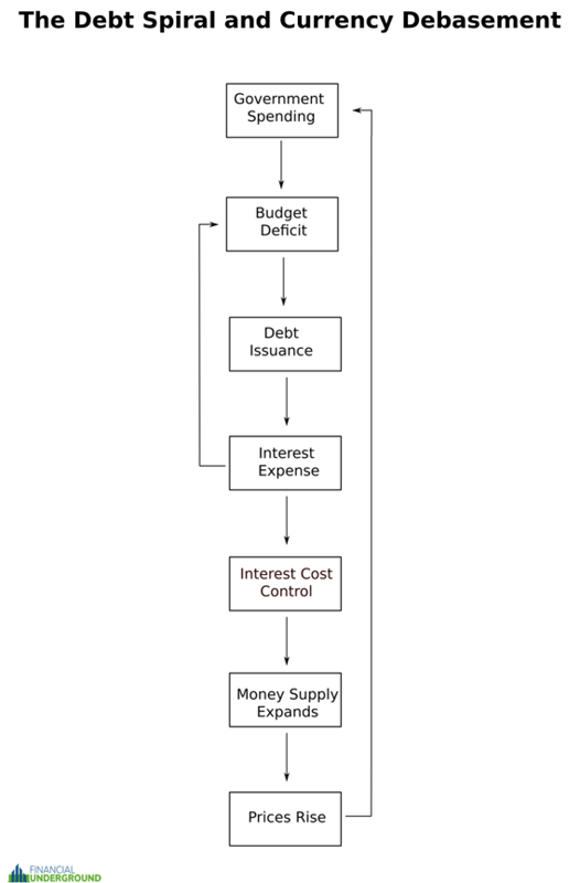 To pogłębia problem, ponieważ rosnące wydatki mogą być finansowane tylko poprzez dalsze osłabianie waluty. Dlatego ciągła dewaluacja waluty jest nieuniknionym skutkiem spirali zadłużenia rządu USA. To samonapędzająca się pętla, z której nie ma wyjścia.