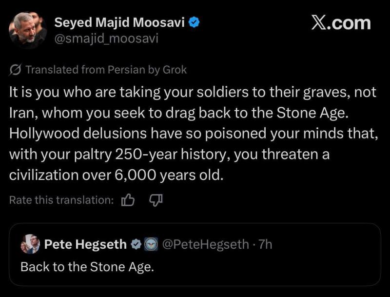 Najwyraźniej Trump podziela poglądy swojego sekretarza wojny. Być może on sam również zmierza ku starczej demencji. W przemówieniu do narodu 1 kwietnia 2026 roku zagroził Iranowi: "Cofniemy ich do epoki kamienia łupanego, gdzie ich miejsce.”[12] W odpowiedzi dowódca Sił Kosmicznych Korpusu Strażników Rewolucji Islamskiej, Majid Mousavi, odpowiedział dumnie i z pewnością siebie 2 kwietnia 2026 roku w serwisie X: "To wy wysyłacie swoich żołnierzy do grobu, nie Iran, który chcecie cofnąć do epoki kamienia łupanego. Hollywoodzkie iluzje tak zniekształciły wasze myślenie, że ze swoją nieistotną 250-letnią historią grozicie cywilizacji liczącej ponad sześć tysięcy lat.”[13]