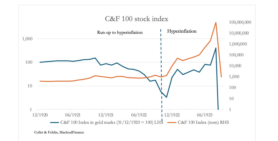 W okresie poprzedzającym hiperinflację, złoto zaczęło osiągać lepsze wyniki niż niemiecki indeks akcji opracowany przez Collet & Fohlin, na co wskazywała różnica między zamknięciami obu indeksów. Indeks C&F wzrósł z 375 punktów w lutym 1921 r. do 1250 punktów w październiku, a następnie spadł do 750 punktów w czerwcu 1922 r. Wartość ta była mierzona w markach niemieckich. W złocie osiągnął on szczyt na poziomie 152 punktów w lutym 1921 r., a następnie spadł do zaledwie 3 punktów w listopadzie 1922 r. W okresie hiperinflacji, który nastąpił po tym okresie, nastąpiła znaczna zmienność, zanim indeks stał się bezwartościowy w porównaniu z wyceną w złocie.