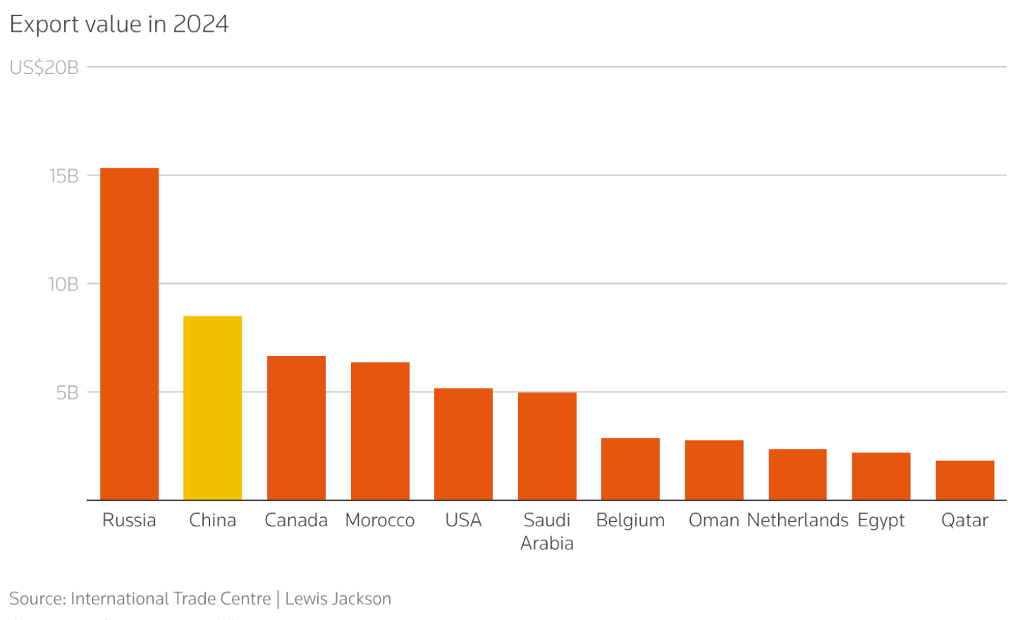 Ponadto kraje G7 borykają się z protekcjonizmem ze strony innych eksporterów tych towarów. Chiny ogłosiły zakaz eksportu nawozów w celu ochrony swojego rynku krajowego, ograniczając tym samym podaż dostępną dla importerów. Poniższy wykres ilustruje znaczenie tego posunięcia Chin. Inne kraje eksportujące prawdopodobnie pójdą w ich ślady, co sprawi, że Rosja stanie się jedynym znaczącym globalnym dostawcą.